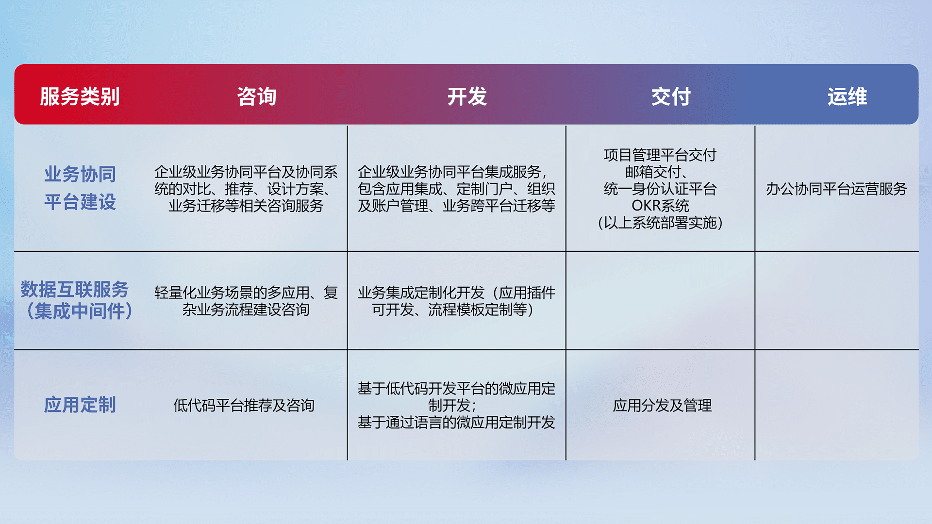 针对钉钉、、、、企微、、、、IDaas等平台级产品提供产品的规划、、方案、、、、交付、、、定制化开发等服务,,,实现如统一协同办公、、、、智能客户服务、、、、混合会议管理、、智能数据查询、、等业务场景,,实现数字化转型。。。。